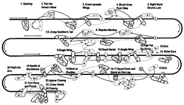 A 24 lépéses forma elemeit négy mester segítségével 1956-ban rögzítette a Kínai Sportbizottság.